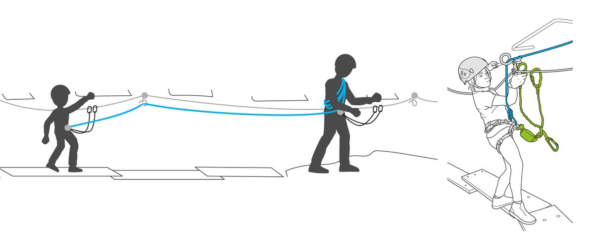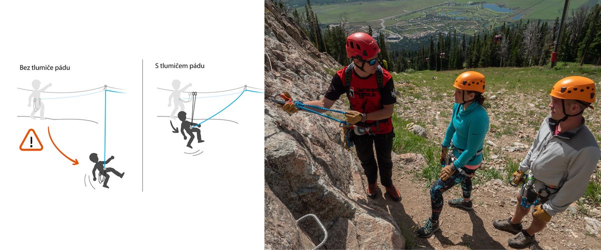 UPOZORNĚNÍ: Použití tlumiče pádu je u traverzování nezbytné, aby se v případě pádu zabránilo kyvadlovému pohybu. Dítě musí vždy zůstat pod zajišťovacím vedením ferraty.