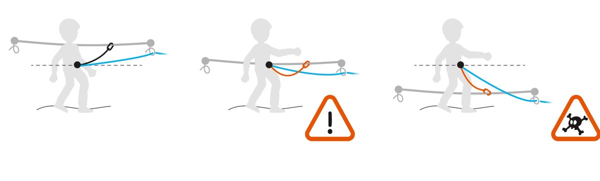 Abyste se vyhnuli přecvakávání smyček tlumiče pádu a usnadnili dítěti postup, můžete obě smyčky připojit do materiálových poutek na úvazku dítěte.