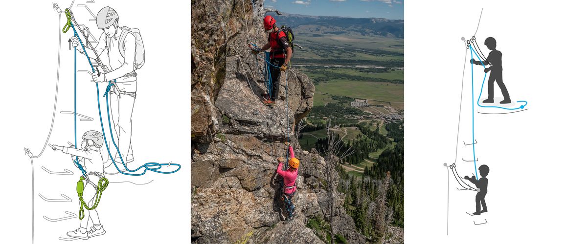 Oba navázaní na krátkém laně (3 až 6 m). Ujistěte se, že mezi vámi a dítětem je vždy jeden jisticí bod (prasečí ocásek nebo expreska).